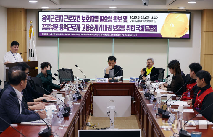 [서울=뉴시스] 고승민 기자 = 24일 서울 여의도 국회 의원회관에서 열린 용역근로자 근로조건 보호지침 실효성 확보 및 공공부문 용역근로자 고용승계기대권 보장을 위한 국회토론회에서 권영국 정의당 대표가 발언하고 있다. 2025.03.24. [email protected]