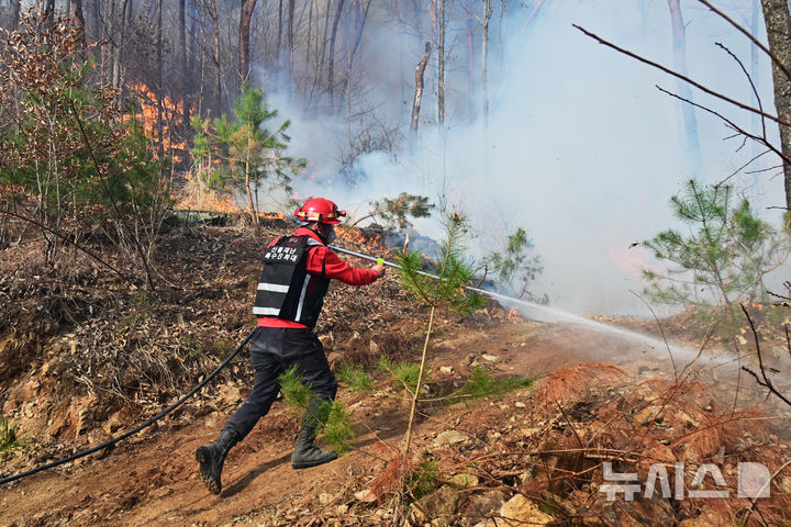 [산청=뉴시스] 차용현 기자 = 경남 산청군에서 발생한 대형 산불이 4일째로 접어든 24일 오후 산청군 산불전문진화대 홍구탁 대장과 대원들이 진화작업을 펼치고 있다. 2025.03.24. [email protected]