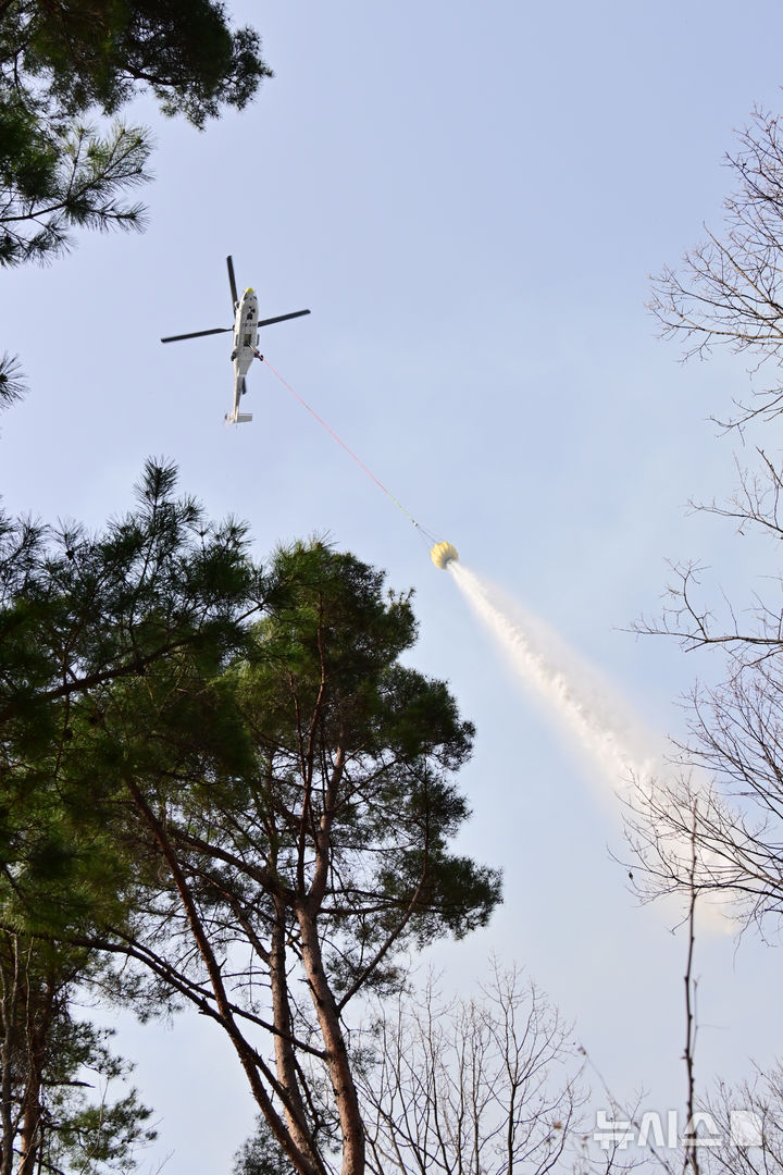 [산청=뉴시스] 차용현 기자 = 경남 산청군에서 발생한 대형 산불이 4일째로 접어든 24일 오후 산불진화헬기가 물을 뿌리고 있다. 2025.03.24. [email protected]