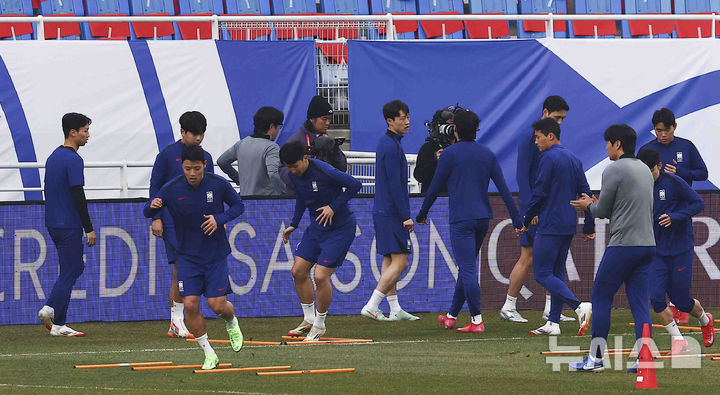 [수원=뉴시스] 김근수 기자 = 대한민국 축구 국가대표팀 선수들이 24일 경기 수원월드컵경기장에서 북중미 월드컵 아시아 3차예선 요르단전을 앞두고 공식 훈련을 하고 있다. 2025.03.24. [email protected]