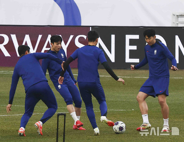 [수원=뉴시스] 김근수 기자 = 대한민국 축구 국가대표팀 손흥민과 선수들이 24일 경기 수원월드컵경기장에서 북중미 월드컵 아시아 3차예선 요르단전을 앞두고 공식 훈련을 하고 있다. 2025.03.24. [email protected]