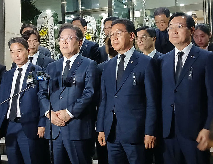 [창녕=뉴시스] 이재명 더불어민주당 대표 등이 24일 오후 경남 산청군 시천면에서 발생한 산불 진압에 투입됐던 순직자 4명의 합동분향소인 창녕군민체육관을 방문해 고인을 추모한 후 발언하고 있다. (사진=독자 제공) 2025.03.24. [email protected] *재판매 및 DB 금지
