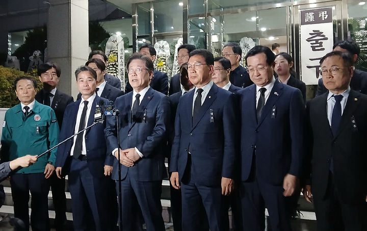 [창녕=뉴시스] 이재명 더불어민주당 대표 등이 24일 오후 경남 산청군 시천면에서 발생한 산불 진압에 투입됐던 순직자 4명의 합동분향소인 창녕군민체육관을 방문해 고인을 추모한 후 발언하고 있다. (사진=독자 제공) 2025.03.24. [email protected] *재판매 및 DB 금지