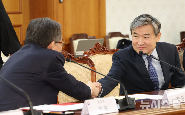 [서울=뉴시스] 조수정 기자 = 조태용 국가정보원장과 조태열(왼쪽) 외교부 장관이 24일 정부서울청사에서 열린 한덕수 대통령 권한대행 국무총리 주재 국가안전보장회의(NSC)에 참석해 인사나누고 있다. 2025.03.24. [email protected]