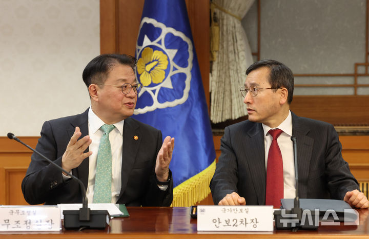 [서울=뉴시스] 조수정 기자 = 방기선(왼쪽) 국무조정실장과 인성환 국가안보실 2차장이 24일 정부서울청사에서 열린 한덕수 대통령 권한대행 국무총리 주재 국가안전보장회의(NSC)에 앞서 대화하고 있다. 2025.03.24. [email protected]
