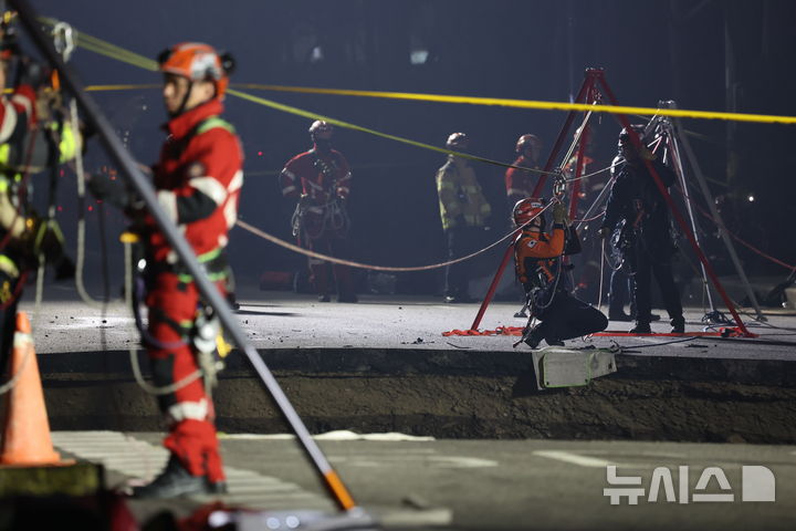 [서울=뉴시스] 김근수 기자 = 24일 서울 강동구 명일동 한 도로에 발생한 대형 싱크홀 현장에서 소방대원들이 매몰된 실종자 구조작업을 하고 있다. 2025.03.24. [email protected]