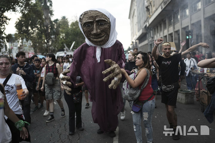 [부에노스아이레스=AP/뉴시스] 24일(현지 시간) 아르헨티나 부에노스아이레스에서 군사 쿠데타 발발 49주년을 맞아 '마요 광장의 어머니'를 형상화한 인형을 든 시위대가 행진하고 있다. '마요 광장의 어머니들'은 1976년 3월 24일 발생한 군사 쿠데타 이후 실종된 사람들의 어머니들로 흰색 스카프를 착용하고 '실종자 되찾기'와 '책임자 처벌'을 요구하며 매주 집회를 열고 있다. 2025.03.25.