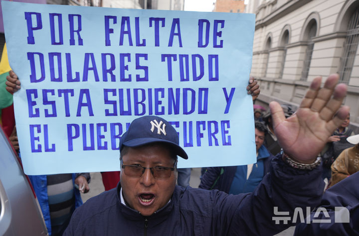 [라파스=AP/뉴시스] 24일(현지 시간) 볼리비아 라파스에서 식료품 가격 인상에 항의하는 시위가 열린 가운데 한 거리 상인이 "달러 부족으로 모든 것이 오르고 사람들은 고통받고 있다"라는 문구 앞에서 구호를 외치고 있다. 2025.03.25.