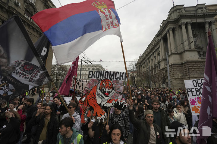 [베오그라드=AP/뉴시스] 24일(현지 시간) 세르비아 베오그라드에서 도널드 트럼프 미국 대통령 사위 재러드 쿠슈너의 기업이 진행하는 부동산 재개발 사업에 반대하는 시위가 열리고 있다. 세르비아 정부는 지난해 쿠슈너가 운영하는 투자회사를 이 재개발 사업자로 선정했다. 이 사업은 1999년 미군이 주도, 북대서양조약기구(NATO)의 폭격을 받은 옛 국방부 건물 터를 호텔과 아파트 단지로 재개발하는 사업이다. 2025.03.25.