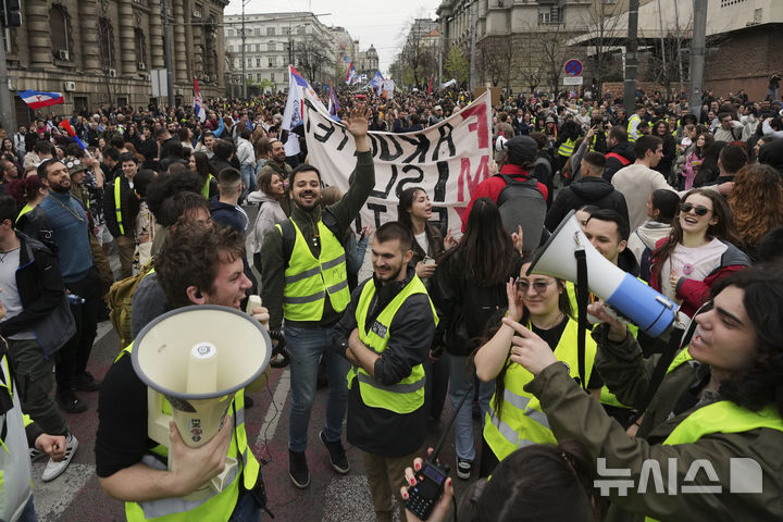 [베오그라드=AP/뉴시스] 24일(현지 시간) 세르비아 베오그라드에서 도널드 트럼프 미국 대통령 사위 재러드 쿠슈너의 기업이 진행하는 부동산 재개발 사업에 반대하는 시위가 열리고 있다. 세르비아 정부는 지난해 쿠슈너가 운영하는 투자회사를 이 재개발 사업자로 선정했다. 이 사업은 1999년 미군이 주도, 북대서양조약기구(NATO)의 폭격을 받은 옛 국방부 건물 터를 호텔과 아파트 단지로 재개발하는 사업이다. 2025.03.25.