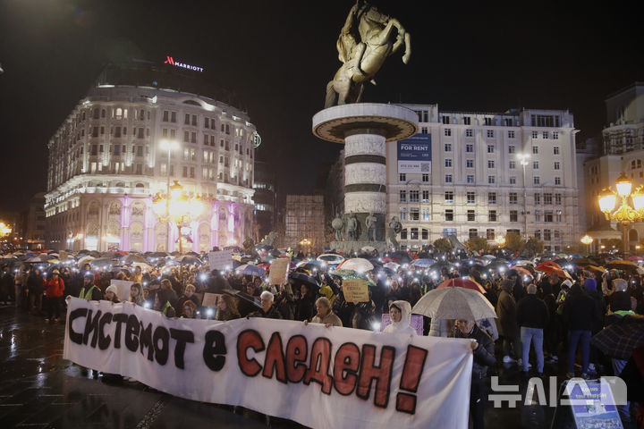 [스코페=AP/뉴시스] 24일(현지 시간) 북마케도니아 스코페에서 나이트 클럽 화재 희생자들을 위한 시위가 열려 시위대가 안전 규정, 부정부패 척결 등 사회적 시스템의 개선을 요구하는 현수막을 들고 있다. 지난 16일 코차니 나이트클럽 '클럽 펄스'에서 콘서트 도중 화재가 발생해 59명이 숨지고 170여 명이 부상했다. 2025.03.25.