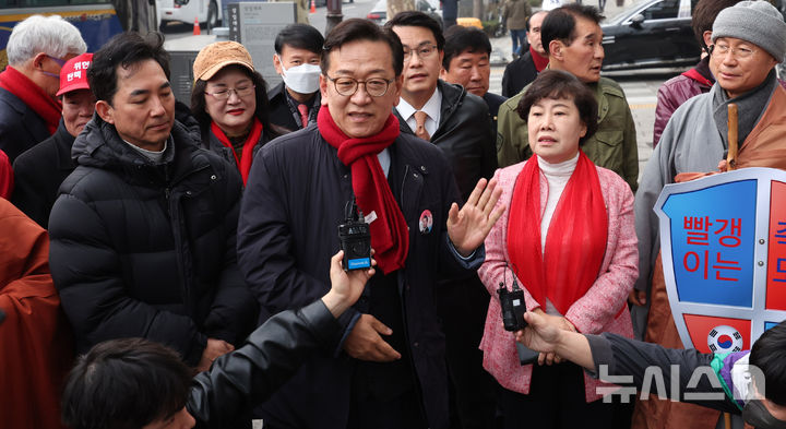 [서울=뉴시스] 추상철 기자 = 25일 오전 서울 종로구 헌법재판소 인근에서 열린 '윤석열 대통령 탄핵 각하 기원 인간띠 잇기 기도 행진'에 앞서 석동현 변호사가 발언을 하고 있다. 2025.03.25. [email protected]