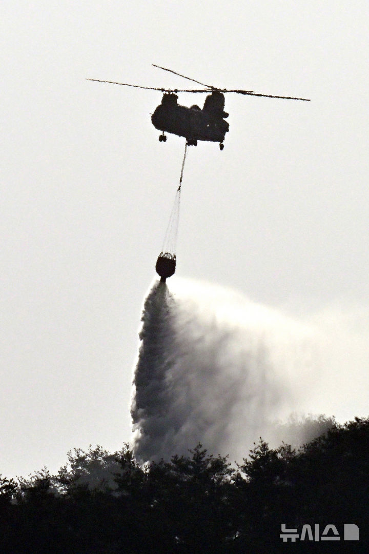 [하동=뉴시스] 차용현 기자 = 25일 오후 지난 21일 경남 산청군에서 발생한 대형 산불이 산등성이를 타고 하동군 옥종면으로 확산되면서 산림당국이 군용헬기를 동원해 진화작업을 펼치고 있다. 2025.03.25. [email protected]