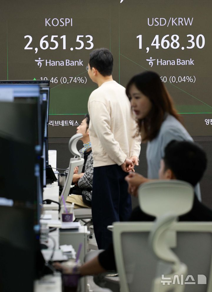 [서울=뉴시스] 고범준 기자 = 코스피가 전 거래일(2632.07)보다 20.97포인트(0.80%) 상승한 2653.04에 개장한 25일 오전 서울 중구 하나은행 딜링룸 전광판에 지수가 표시되고 있다.