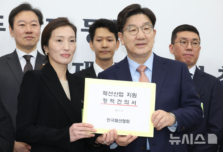 [서울=뉴시스] 고승민 기자 = 권성동 국민의힘 원내대표가 25일 서울 여의도 국회에서 열린 패션산업 지원 정책간담회에서 성래은 한국패션협회장에게 정책건의서를 받으며 기념촬영하고 있다. 2025.03.25. [email protected]