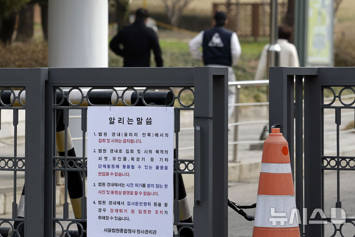 [서울=뉴시스] 최동준 기자 = 이재명 더불어민주당 대표 공직선거법 위반 항소심 선고를 하루 앞둔 25일 서울 서초구 서울중앙지방법원에 보안 강화 안내문이 붙어 있다. 2025.03.25. [email protected]