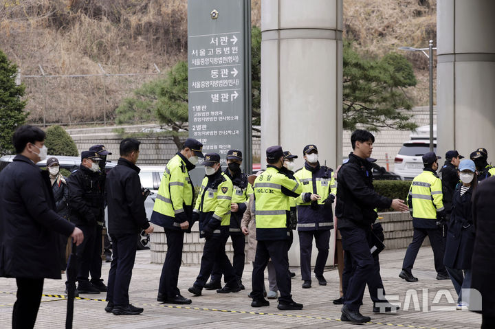 [서울=뉴시스] 최동준 기자 = 25일 서울 서초구 서울중앙지방법원에서 경찰이 이재명 더불어민주당 대표의 공판 출석 전 질서 유지를 위해 경계를 서고 있다. 2025.03.25. [email protected]