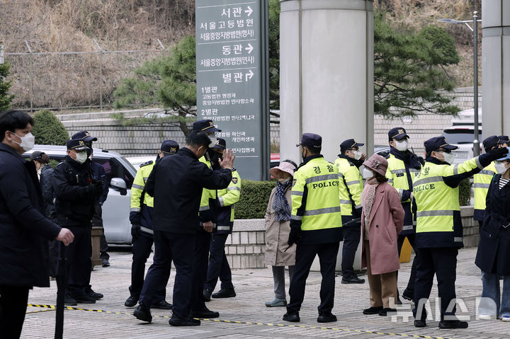 [서울=뉴시스] 최동준 기자 = 25일 서울 서초구 서울중앙지방법원에서 경찰이 이재명 더불어민주당 대표의 공판 출석 전 질서 유지를 위해 경계를 서고 있다. 2025.03.25. [email protected]