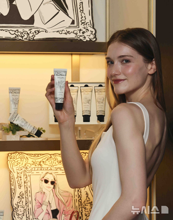 [서울=뉴시스] 김근수 기자 = 25일 서울 중구 레스케이프 호텔에서 열린 프리미엄 라이프스타일 브랜드 아르주엘(ARJUEL) 포토행사에서 모델이 제품을 들고 포즈를 취하고 있다. 2025.03.25. [email protected]