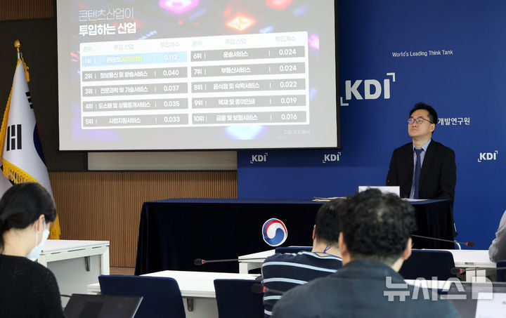 [세종=뉴시스] 강종민 기자 = 이진국 KDI 산업·시장정책연구부 선임연구위원이 25일 세종시 정부세종청사에서 콘텐츠 산업의 성장 추이와 국가 경제에 미치는 영향, 기업의 성장 요인 등을 설명하고 있다. 2025.03.25. [email protected]
