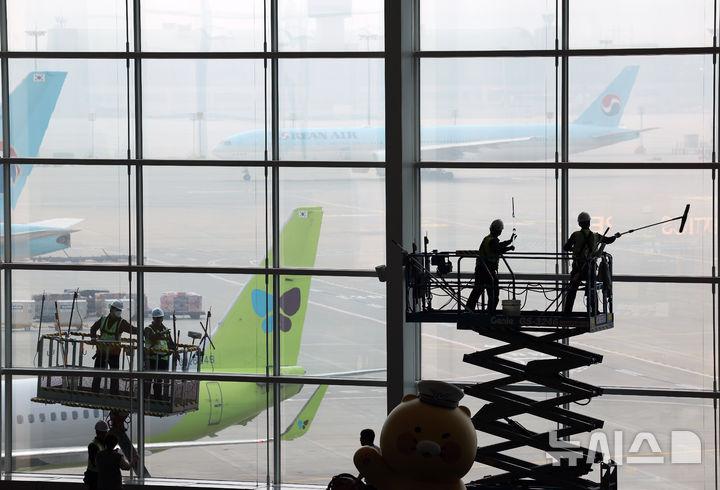 [인천공항=뉴시스] 김명년 기자 = 25일 오전 인천국제공항 제2여객터미널에서 환경미화원들이 터미널 유리 외벽 물청소를 하고 있다. 대청소 작업은 인천공항 시설 전반을 대상으로 오는 29일까지 진행되며, 매일 800여명의 인력과 200여 대의 장비가 투입된다. 2025.03.25. [email protected]