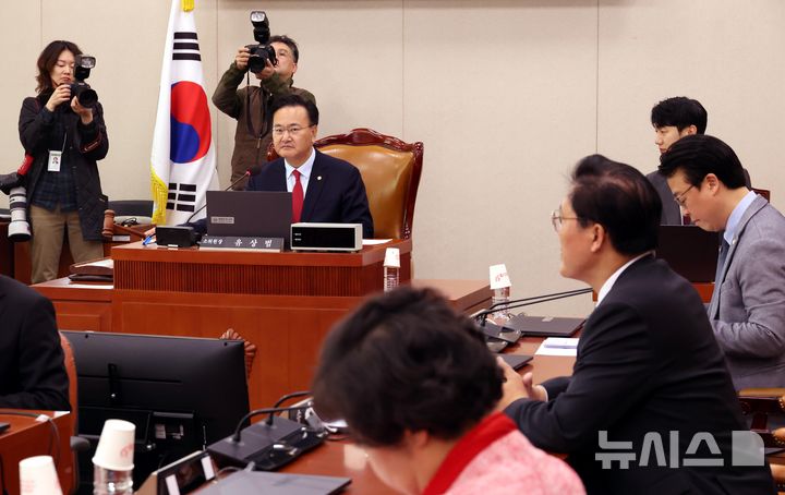 [서울=뉴시스] 조성봉 기자 = 유상범 국회 법사위 법안심사 제2소위원장이 25일 오후 서울 여의도 국회에서 열린 법제사법위원회 법안심사제2소위원회에서 의사봉을 두드리고 있다. 이날 법안심사 제2소위에서는 코로나바이러스감염증-19 예방접종 피해보상 등에 관한 특별법안(대안)에 대해 심사할 예정이다. [email protected]