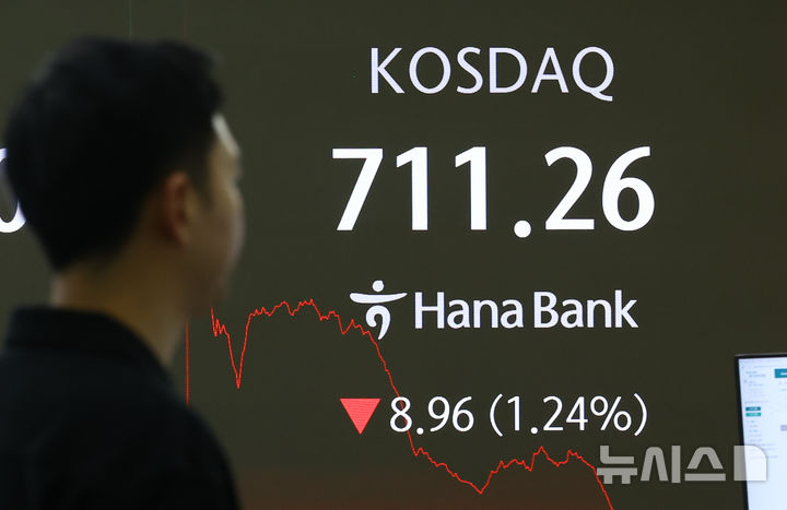 [서울=뉴시스] 황준선 기자 = 코스닥 지수가 전 거래일(720.22)보다 8.96포인트(1.24%) 하락한 711.26에 거래를 마친 25일 서울 중구 하나은행 딜링룸에서 딜러들이 업무를 보고 있다. 2025.03.25. [email protected]