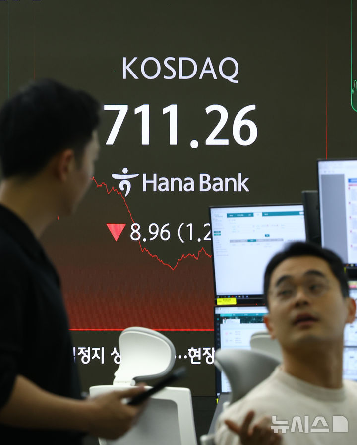 [서울=뉴시스] 황준선 기자 = 코스닥 지수가 전 거래일(720.22)보다 8.96포인트(1.24%) 하락한 711.26에 거래를 마친 25일 서울 중구 하나은행 딜링룸에서 딜러들이 업무를 보고 있다. 2025.03.25. [email protected]