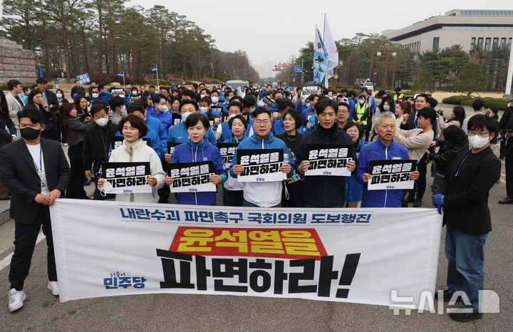 [서울=뉴시스] 고승민 기자 = 더불어민주당 박찬대 원내대표와 의원들이 25일 서울 여의도 국회에서 광화문까지 내란수괴 파면촉구 국회의원 도보행진을 하기 전 구호를 외치고 있다. 2025.03.25. [email protected]
