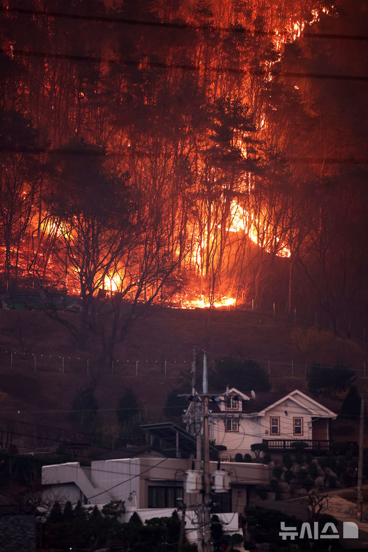 [안동=뉴시스] 이무열 기자 = 경북 의성군 산불 발생 나흘째인 25일 산불이 안동시 남후면 광음리 마을 인근까지 번지고 있다. 2025.03.25. [email protected]