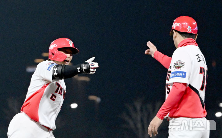 [광주=뉴시스] 김혜인 기자 = 25일 오후 광주 북구 기아챔피언스필드에서 열린 2025 프로야구 KIA타이거즈와 키움 히어로즈의 경기, KIA 나성범이 3회 말 연타석 홈런을 친 뒤 세리머니하고 있다. 2025.03.25. [email protected]