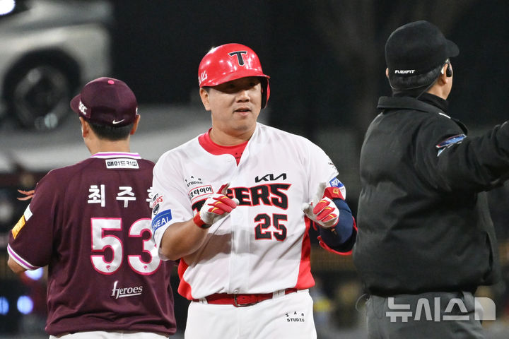 [광주=뉴시스] 이영주 기자 = 25일 오후 광주 북구 광주-기아챔피언스필드에서 열린 2025 신한 쏠뱅크 KBO 리그 키움히어로즈 대 KIA타이거즈의 경기, 8회 말 주자 없음 상황 홈런성 타구를 날린 KIA 이우성이 양 손가락으로 네모를 그리며 비디오 판독을 요구하고 있다. [email protected]