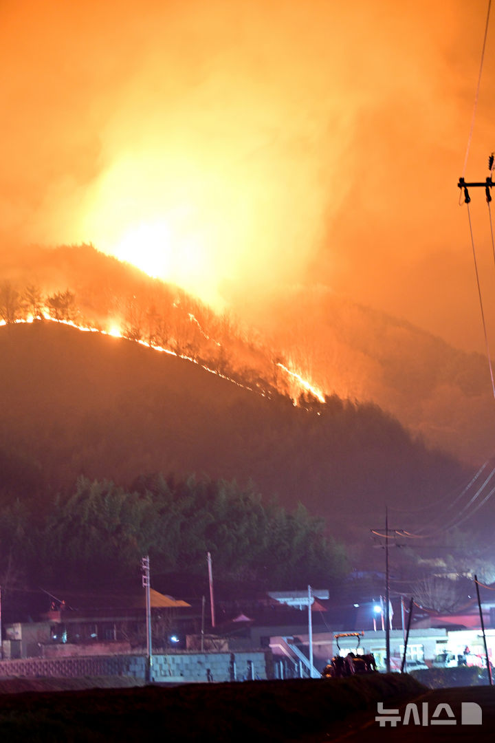 [하동=뉴시스] 차용현 기자 = 25일 오후 지난 21일 경남 산청군에서 발생한 대형 산불이 산등성이를 타고 하동군 옥종면 안계마을 인근 으로 확산되면서 소방당국을 긴장케하고 있다.. 2025.03.25. [email protected]