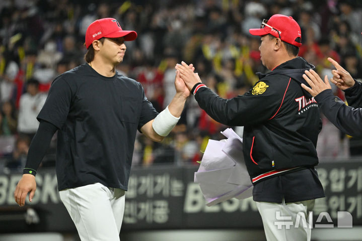 [광주=뉴시스] 이영주 기자 = 25일 오후 광주 북구 광주-기아챔피언스필드에서 열린 2025 신한 쏠뱅크 KBO 리그 키움히어로즈 대 KIA타이거즈의 경기, 이범호 KIA 감독이 11-6으로 승리하고 덕아웃으로 돌아오는 선수들과 인사하고 있다. [email protected]