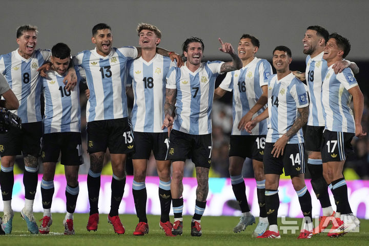 [부에노스아이레스=AP/뉴시스] 아르헨티나 선수들이 25일(현지 시간) 아르헨티나 부에노스아이레스의 모뉴멘탈 경기장에서 열린 2026 국제축구연맹(FIFA) 북중미 월드컵 남미예선 14차전에서 브라질을 꺾은 후 자축하고 있다. 아르헨티나가 4-1로 승리하고 10승1무3패(승점31) 조 1위로 본선 진출을 확정했다. 2025.03.26.