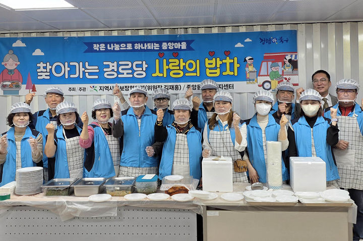 [광주=뉴시스] 박기웅 기자 = 26일 광주 북구 중앙동 행정복지센터에서 열린 '찾아가는 경로당 사랑의 밥차' 행사에서 관계자들이 기념사진을 찍고 있다. 이날 중앙동과 지역사회보장협의체는 지역 어르신들을 초청해 복지상담과 건강진료, 배식 봉사 등을 펼쳤다. (사진 = 광주 북구 제공) 2025.03.26. [email protected]