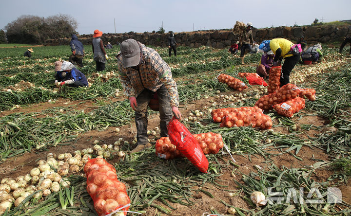 [서귀포=뉴시스] 우장호 기자 = 26일 오전 제주 서귀포시 대정읍 신도리 일원에서 농민들이 올해 첫 조생양파를 수확하고 있다.