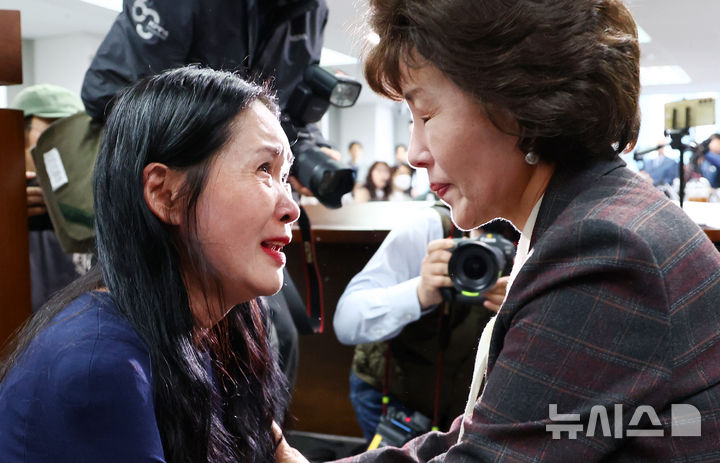 [서울=뉴시스] 전신 기자 = 26일 서울 중구 진실·화해를위한과거사정리위원회에서 열린 해외입양과정 인권침해 사건 진실규명 결정 발표 기자회견에서 해외 입양인 김유리 씨가 박선영 위원장 앞에서 무릎을 꿇고 진실규명을 호소하고 있다. 2025.03.26. [email protected]