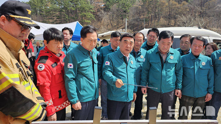 [울산=뉴시스] 배병수 기자 = 26일 울산 울주군 온양읍 산림재난 지휘본부에 국민의힘 김기현(왼쪽 세번째), 박성민(왼쪽 다섯번째) 국회의원이 방문해 김두겸(왼쪽 네번째)시장으로부터 산불현황 설명을 듣고 있다. [email protected].