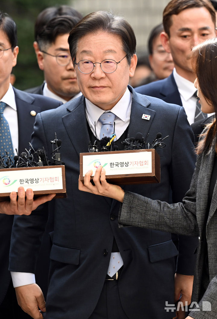[서울=뉴시스] 사진공동취재단 = 이재명 더불어민주당 대표가 26일 서울 서초구 서울고등법원에서 열린 공직선거법 위반 혐의 항소심 선고 공판에 출석하고 있다. 2025.03.26. [email protected]