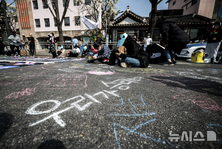 [서울=뉴시스] 정병혁 기자 = 26일 서울 종로구 자하문로에서 열린 윤석열 파면 촉구 시민사회단체 결의대회에서 참가자들이 윤석열 대통령 파면을 촉구하는 메시지가 도로에 적혀 있다. 2025.03.26. [email protected]