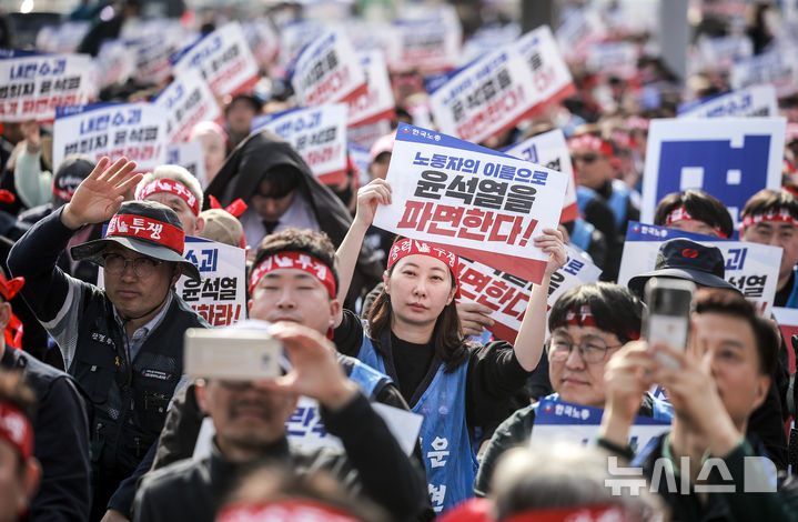 [서울=뉴시스] 정병혁 기자 = 26일 서울 종로구 동십자각 앞에서 열린 윤석열 즉각 파면을 위한 한국노총 전국단위노조대표자 및 상근간부 결의대회에서 한국노총 조합원들이 피켓을 들고 있다. 2025.03.26. [email protected]
