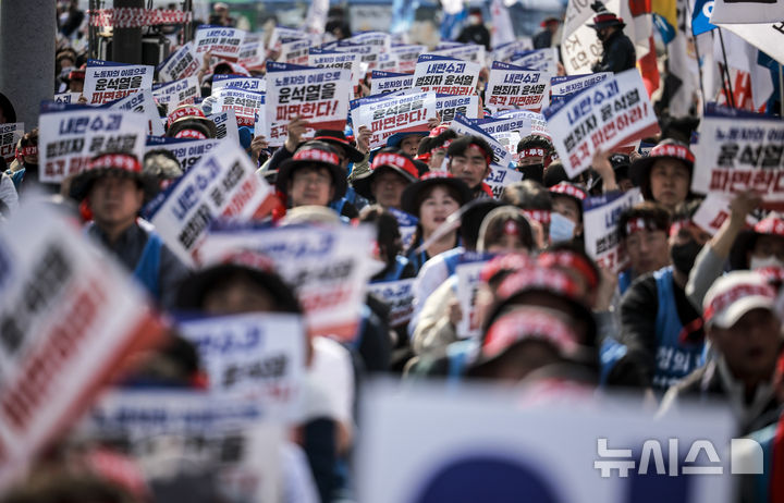 [서울=뉴시스] 정병혁 기자 = 26일 서울 종로구 동십자각 앞에서 열린 윤석열 즉각 파면을 위한 한국노총 전국단위노조대표자 및 상근간부 결의대회에서 한국노총 조합원들이 피켓을 들고 있다. 2025.03.26. [email protected]