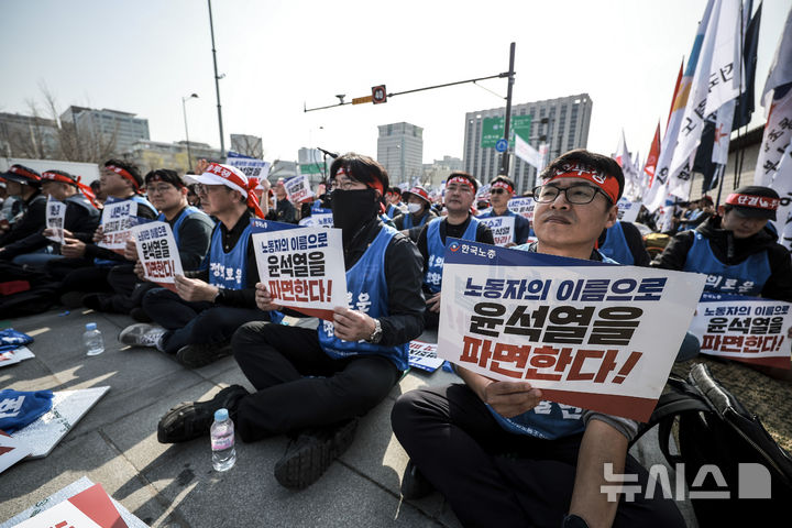 [서울=뉴시스] 정병혁 기자 = 26일 서울 종로구 동십자각 앞에서 열린 윤석열 즉각 파면을 위한 한국노총 전국단위노조대표자 및 상근간부 결의대회에서 한국노총 조합원들이 피켓을 들고 있다. 2025.03.26. [email protected]