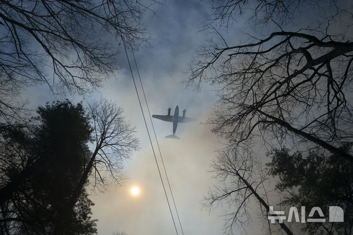 [살루다=AP/뉴시스] 26일(현지 시간) 미 노스캐롤라이나주 살루다 '블랙 코브' 산불 현장 상공에서 소방 항공기 한 대가 진화 작업을 하고 있다. 지난 주말 발생한 이 산불로 지금까지 여의도 면적의 8배 이상이 피해를 본 것으로 알려졌다. 2025.03.27.
