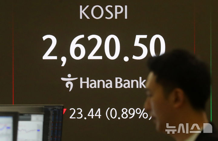 [서울=뉴시스] 김혜진 기자 = 코스피가 전 거래일(2643.94)보다 23.66포인트(0.89%) 하락한 2620.28에 개장한 27일 오전 서울 중구 하나은행 딜링룸 전광판에 지수가 표시되고 있다.