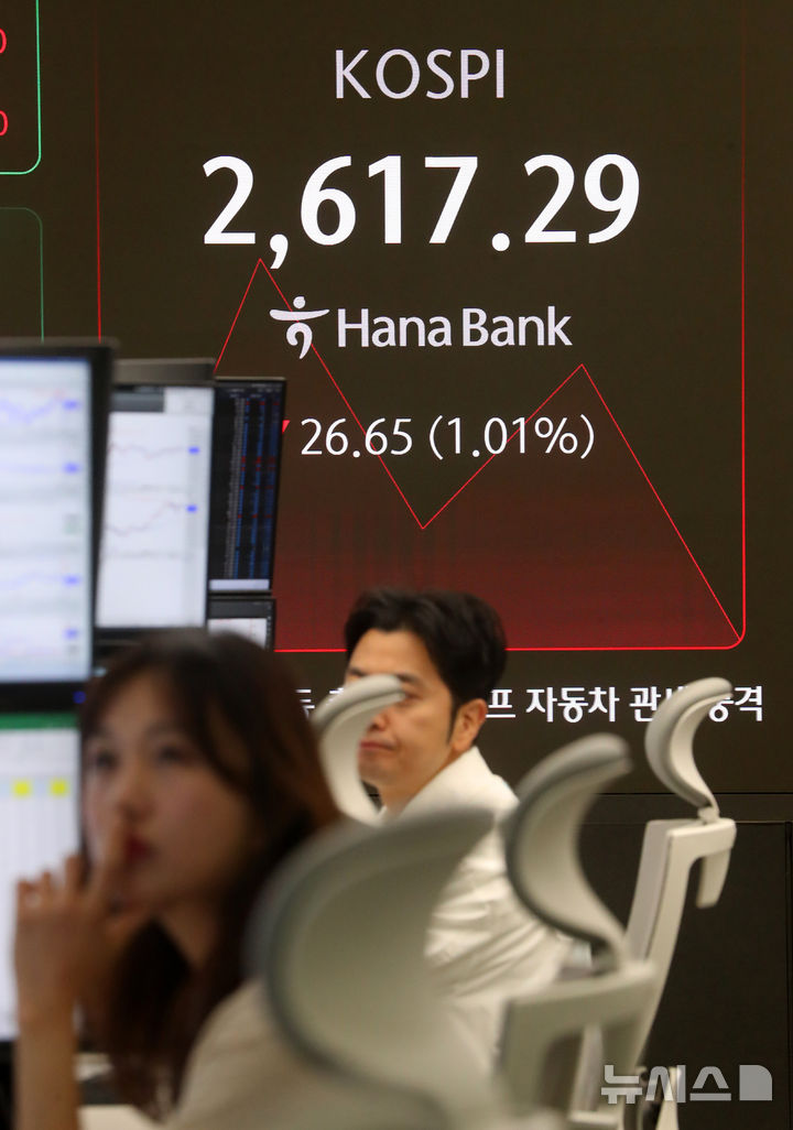 [서울=뉴시스] 김혜진 기자 = 코스피가 전 거래일(2643.94)보다 23.66포인트(0.89%) 하락한 2620.28에 개장한 27일 오전 서울 중구 하나은행 딜링룸 전광판에 지수가 표시되고 있다.