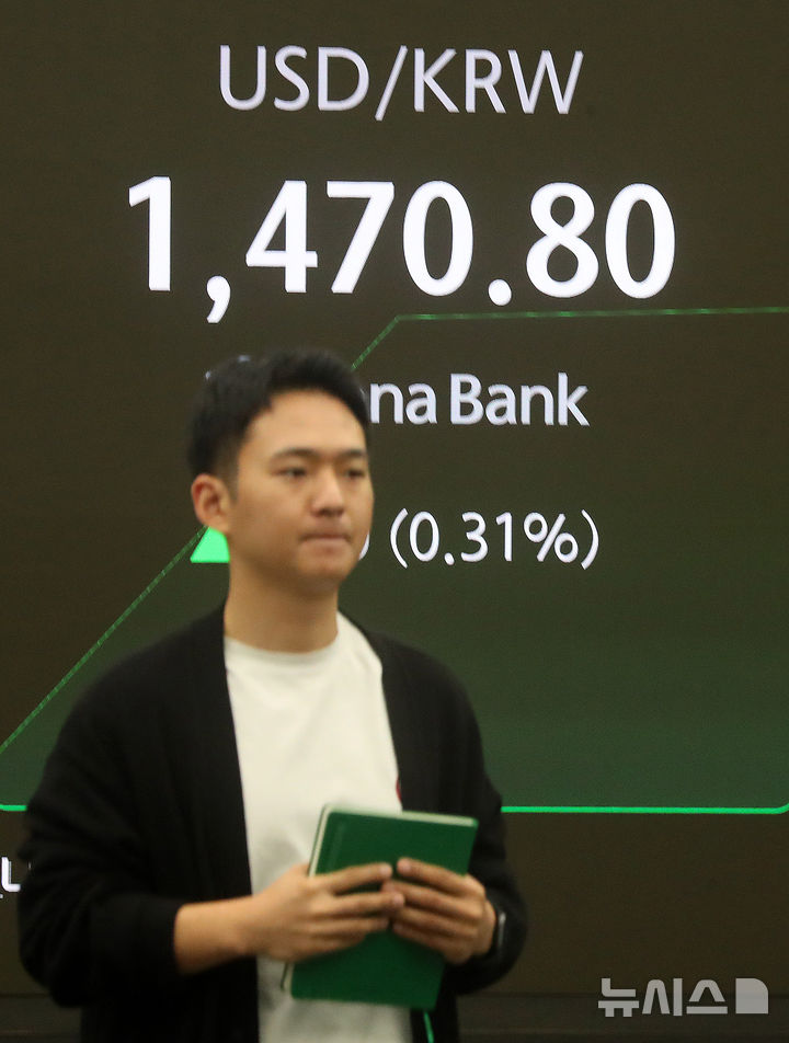 [서울=뉴시스] 김혜진 기자 = 원·달러 환율이 전 거래일 주간거래 종가(1466.3)보다 2.7원 오른 1469원에 개장한 27일 오전 서울 중구 하나은행 딜링룸 전광판에 지수가 표시되고 있다.