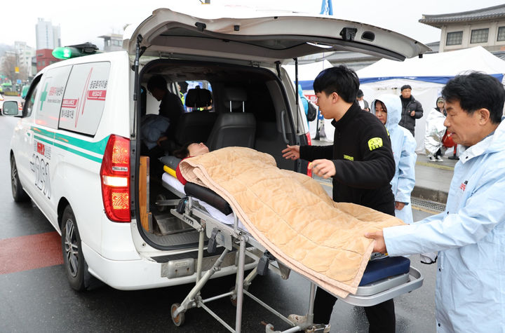 [서울=뉴시스] 고승민 기자 = 단식 10일차를 맞은 정혜경 진보당 의원이 27일 오전 서울 광화문 농성장에서 응급실로 후송되고 있다. (사진=진보당 제공) 2025.03.27. [email protected] *재판매 및 DB 금지