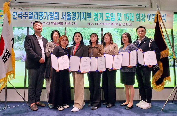 [서울=뉴시스] 지난 26일 저녁 서울 종로구 한 호텔에서 열린 한국 주얼리 평가협회(MVKA)의 서울경기지부 15대 회장 이취임식 및 정기모임에서 제15대 황성호(왼쪽) 회장과 임원진이 기념촬영을 하고 있다. (사진=MVKA제공) 2025.03.27. [email protected] *재판매 및 DB 금지